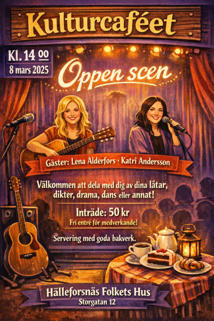 Tillfälle för både kvinnor och män, proffs och amatörer, blyga och ohämmade! Ta fram dina alster ur byrålådan och testa dom på ”Öppen scen” på nästa Kulturcafé. Plats: Folkets hus, Hälleforsnäs. Tid: Söndag 8 mars kl. 14 00. Anmälan görs vid dörren eller till Mats Sylwan Tel/SMS: 070 544 18 24.